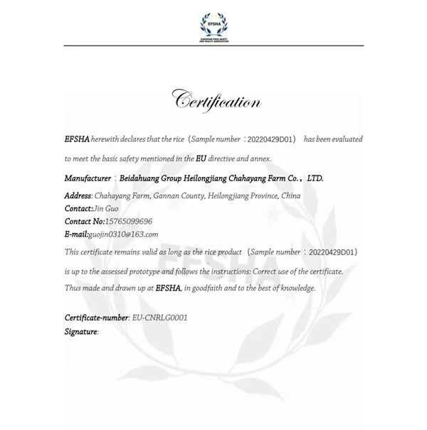 5月7日,查哈陽農(nóng)場接到了歐洲食品安全與健康協(xié)會(huì)食品安全檢測中心發(fā)來的檢測證書,該場產(chǎn)區(qū)的3個(gè)品種的大米樣品通過了歐洲食品安全規(guī)定的所有747項(xiàng)檢測指標(biāo),這標(biāo)志著查哈陽大米成為中國第一個(gè),也是現(xiàn)在唯一可以正式進(jìn)入歐盟市場的國產(chǎn)大米,也意味著中國擁有了第一款世界食品安全等級(jí)最高的大米,查哈陽大米獲得走向世界的通行證。