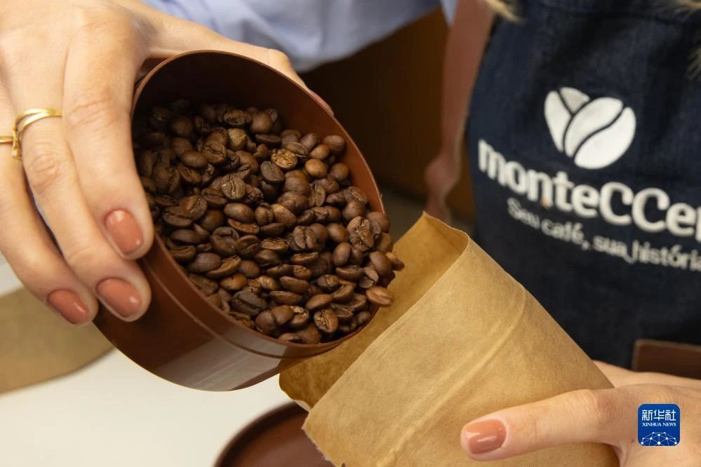 巴西的一家咖啡種植者合作社里,工作人員為咖啡豆裝袋。圖源:新華社