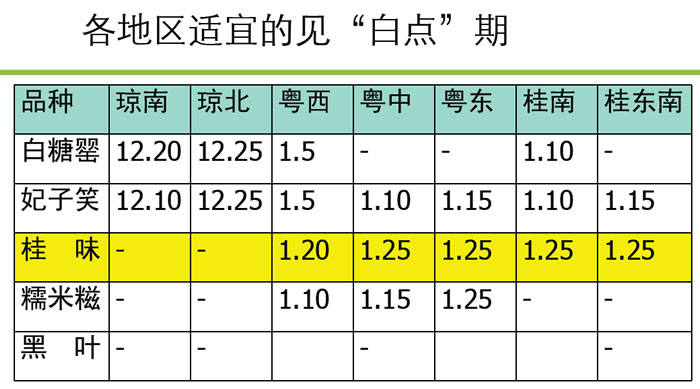 原因分析:秋冬季日照時間長、光照充足、天氣溫暖,是荔枝光合積累的黃金時期。貯藏碳水化合物除滿足成花需求之外,也供給開花和初期坐果之需。荔枝在葉片轉(zhuǎn)綠之后才能進入凈光合狀態(tài)。以見 “白點”時間為節(jié)點,秋梢老熟時間越長,凈光合積累時間越長,積累和貯藏碳水化合物量越多。