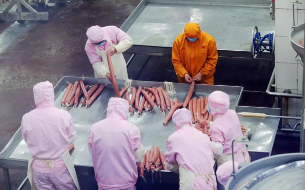 從車間的參觀走廊看去,熟食加工車間內(nèi)10多名工人正在灌裝老北京蒜腸、懸掛上架。而在另一處鮮肉分割車間里,已經(jīng)啟動(dòng)的兩條分割生產(chǎn)線也有條不紊運(yùn)行,工人們將白條豬分割為大大小小的鮮肉,一部分投入市場(chǎng),另一部分裝箱儲(chǔ)存。