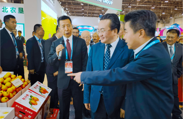 農(nóng)業(yè)農(nóng)村部黨組成員、副部長鄧小剛(前排中),農(nóng)業(yè)農(nóng)村部農(nóng)墾局一級巡視員程景民(前排左),廣東省農(nóng)墾集團公司(農(nóng)墾總局)黨委委員、副總經(jīng)理(副局長)莫仕文(前排右)到廣東農(nóng)墾展位調(diào)研指導(dǎo)