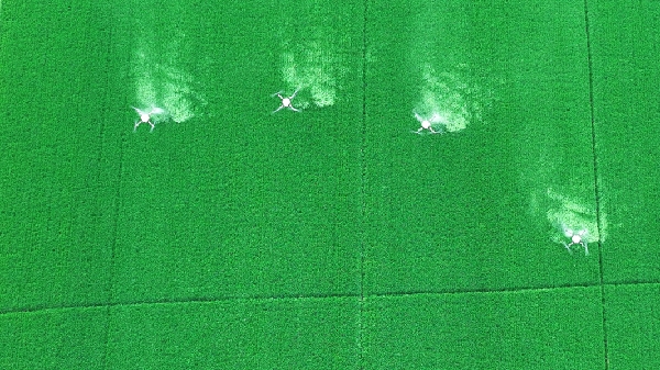 東風(fēng)湖農(nóng)場采取植保無人機編隊協(xié)同作業(yè)的方式,精準(zhǔn)高效噴施混合藥劑,全面推進(jìn)“一噴三防”工作。(高 原)