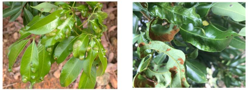 為害癥狀:當(dāng)前荔枝癭螨以成螨、若螨刺吸荔枝新梢嫩葉的汁液。幼葉被害后,在葉背面先出現(xiàn)黃綠色的凹陷斑塊,正面凸起,導(dǎo)致葉面扭曲、畸形,如“狗耳”狀(圖1-左)。凹陷處長(zhǎng)出無色透明的短絨毛,隨絨毛逐漸增多,色澤也逐漸變成黃褐色、紅褐色至深褐色,形似毛氈狀,故稱為“毛氈病”(圖1-右)。