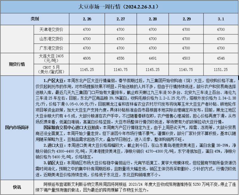 天然橡膠、大豆、玉米市場一周行情(2024.02.26-03.01)