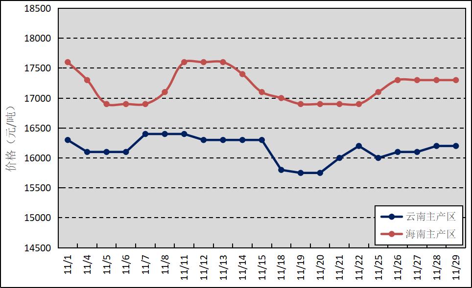 國內(nèi)主產(chǎn)區(qū):11月,云南大部分產(chǎn)區(qū)月底停割,海南產(chǎn)區(qū)正常開展割膠。云南、海南鮮膠乳(折干膠)月均價(jià)格分別為16148元/噸、17186元/噸,環(huán)比下跌496元/噸、1464元/噸。