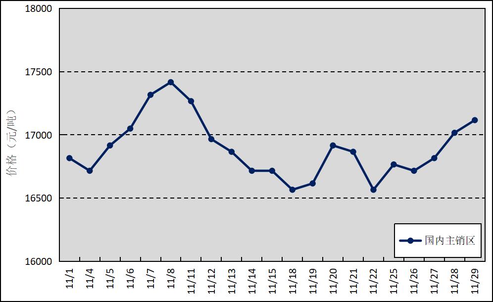 國內(nèi)主銷區(qū):11月,上海、青島和天津等銷區(qū)市場的國產(chǎn)全乳標(biāo)準(zhǔn)膠平均價(jià)格為16892元/噸,環(huán)比下跌209元/噸,最高價(jià)為17417元/噸,最低價(jià)為16567元/噸。
