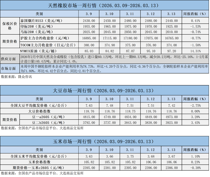 天然橡膠、大豆、玉米市場一周行情(2026.03.09-03.13)