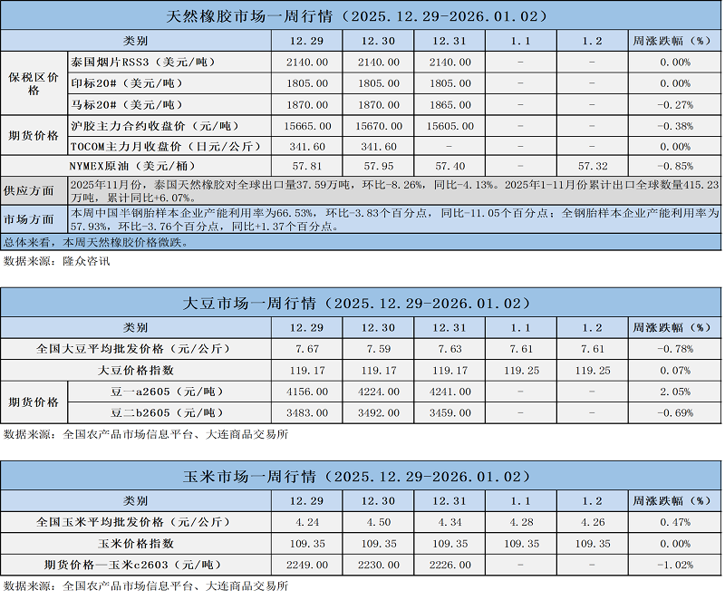 天然橡膠、大豆、玉米市場一周行情(2025.12.29-2026.01.02)