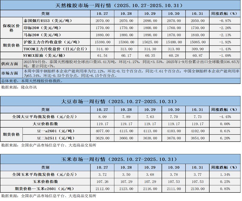 天然橡膠、大豆、玉米市場一周行情(2025.10.27-10.31)