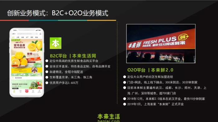 本來集團(tuán)創(chuàng)辦于2012年7月,是一家同時具備農(nóng)產(chǎn)品供應(yīng)鏈全程化管理服務(wù)、自有品牌塑造、媒體整合營銷、自有冷鏈物流、線上生鮮電商、社區(qū)生鮮連鎖新零售等綜合能力的生鮮全產(chǎn)業(yè)鏈集團(tuán)公司,致力于改善食品安全現(xiàn)狀、倡導(dǎo)健康生活方式,憑借八年來在生鮮領(lǐng)域的不斷探索與創(chuàng)新,本來集團(tuán)成功建立起O2O(社區(qū)生鮮連鎖本來鮮)+B2C(本來生活網(wǎng))的新零售模型,該模式可以同時解決時效、新鮮度、流量、履約成本的要求,通過線上線下渠道的打通、互補,圍繞供應(yīng)鏈、零售端、用戶端創(chuàng)造價值。