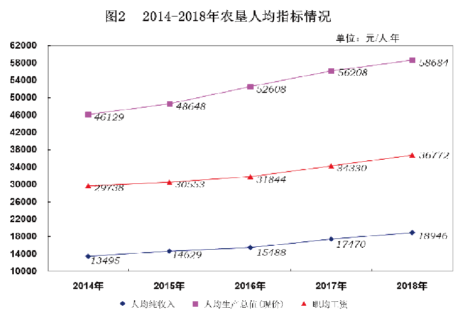 全年農(nóng)墾經(jīng)濟(jì)實(shí)現(xiàn)生產(chǎn)總值8157.20億元(見圖1)。其中,第一產(chǎn)業(yè)增加值1887.75億元;第二產(chǎn)業(yè)增加值3516.68億元;第三產(chǎn)業(yè)增加值2752.77億元。第一、第二、第三產(chǎn)業(yè)增加值占農(nóng)墾生產(chǎn)總值的比重分別為23.1%、43.1%和33.7%。人均生產(chǎn)總值58684元;人均純收入持續(xù)增長(zhǎng),達(dá)到18946元,比上年增長(zhǎng)8.4%(見圖2)。