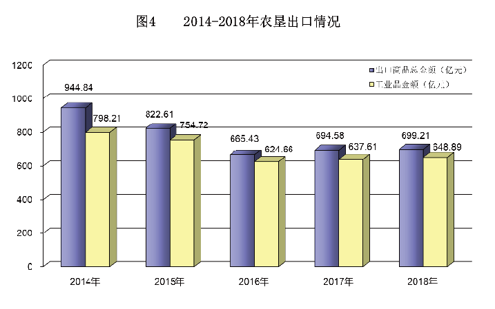 全年出口供貨商品總金額699.21億元(見圖4),比上年增加4.63億元,增長(zhǎng)0.7%。出口商品供貨總額超過10億元的墾區(qū)分別是:新疆兵團(tuán)473.07億元、廣東77.65億元、湖北40.96億元、江西37.07億元、河北24.27億元、廣西10.04億元,上述6個(gè)墾區(qū)出口金額合計(jì)達(dá)663.06億元,占全國農(nóng)墾出口商品總金額的94.8%。